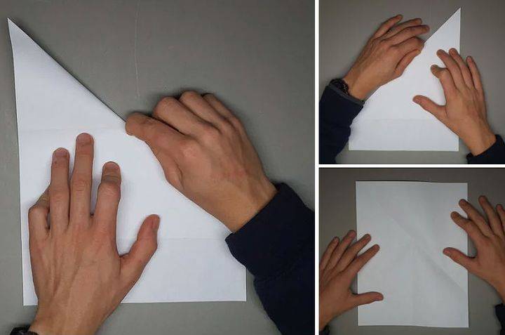 2. Затем раскройте его в первоначальное положение и положите сгибом к верху. Уголки бумаги загните во внутрь — получилась отметка в середине листа. Теперь треугольники получатся ровными, а это поможет сделать макет с хорошими летными качествами