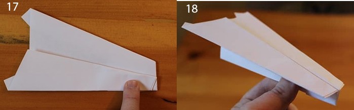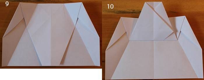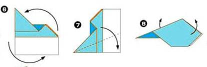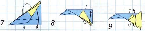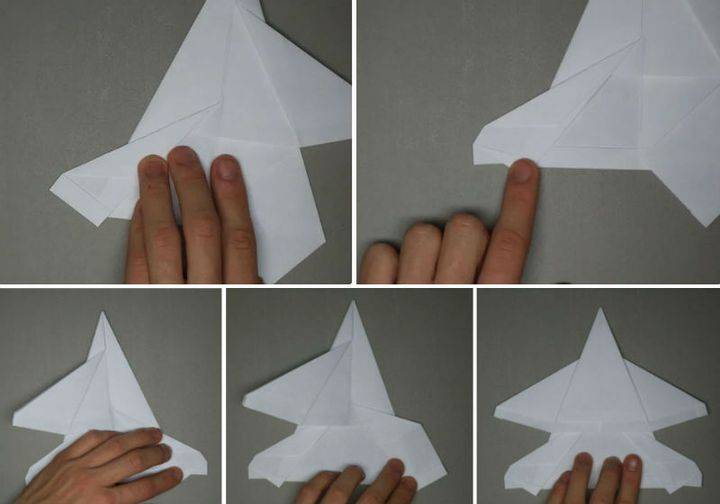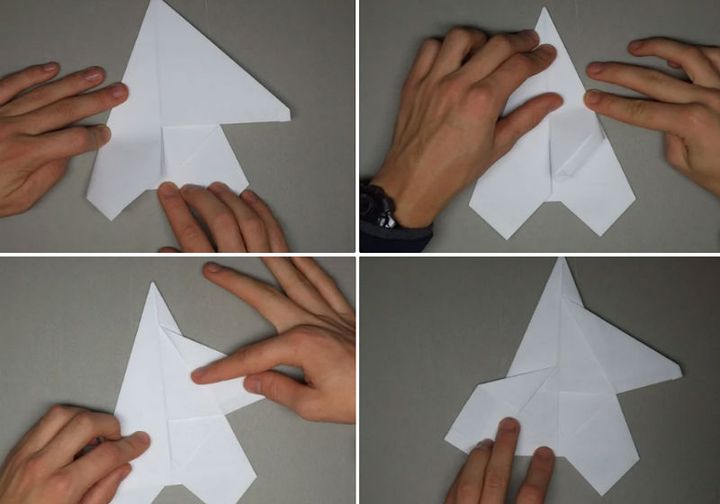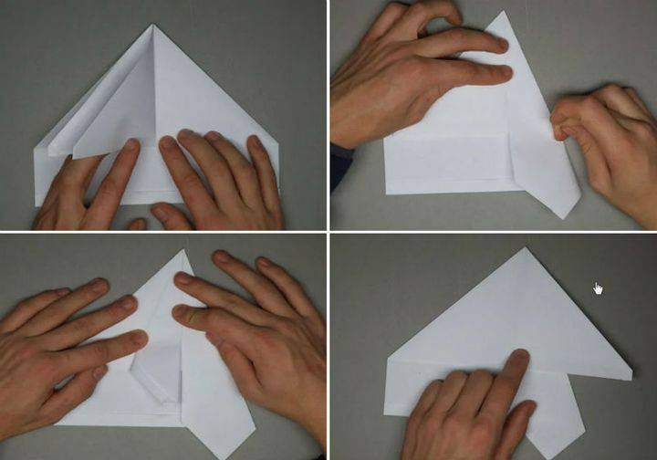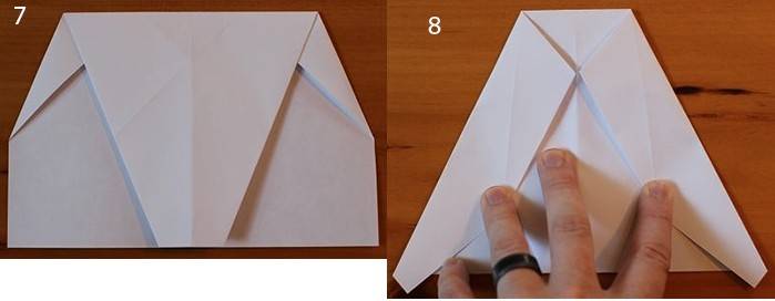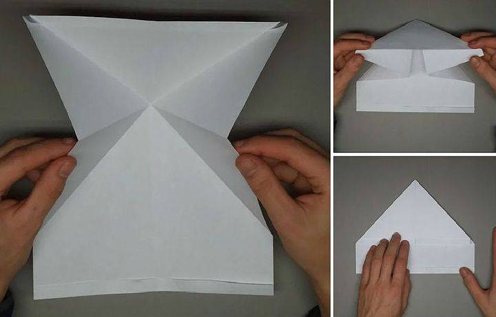 Начало немного иное, чем у предыдущих двух самолетиков. Два уголка загнуть навстречу друг другу. Это будет направляющая складка. Затем крест накрест делаем две другие складки. Получилась подобие буквы Х. Теперь сложите верхний правый угол вниз так, чтобы ее край встречает сгиб, который идет от верхнего левого угла в правый нижний. Сделайте то же самое с левым углом. Верхняя левая точка должна точно соответствовать диагонали правого края самолета. Сложите самолет пополам на себя, а затем разверните. Вы будете использовать эту среднюю складку в качестве ориентира. После того, как вы выполнили предыдущий шаг, сложите сверху вниз так, чтобы ее край встречал нижний край. Согните верхние углы вниз так, чтобы их точки встретились в средней складке. Открыть листок. Как со многими шагами в создании этого самолета, эти складки являются ориентировочными. Теперь возьмите то, что было верхним краем, который вы ранее свернули вниз (3 рис) назад и сложите его обратно вверх в точке, где ее край соответствует складке от предыдущего шага. Соедините углы еще раз так, чтобы их край совпадал с краем верхнего клапана и сгибом из двух шагов назад. Оба угла складываются, встречая верхний клапан и ранее сделанные складки. Это и есть крылья. Сложить крылья еще раз, на этот раз просто складывая вдоль складки, что вы уже сделали. После этого шага ваш самолет должен иметь прямые линии вниз от верха до низа. Оба крыла складываем снова; прямые края сверху вниз. Сложить сверху вниз от того места, где она отвечает верхней части закрылков, которые вы создали в предыдущем шаге. Сложите все это пополам. Вы должны сделать все крылышки на внешней части самолетика