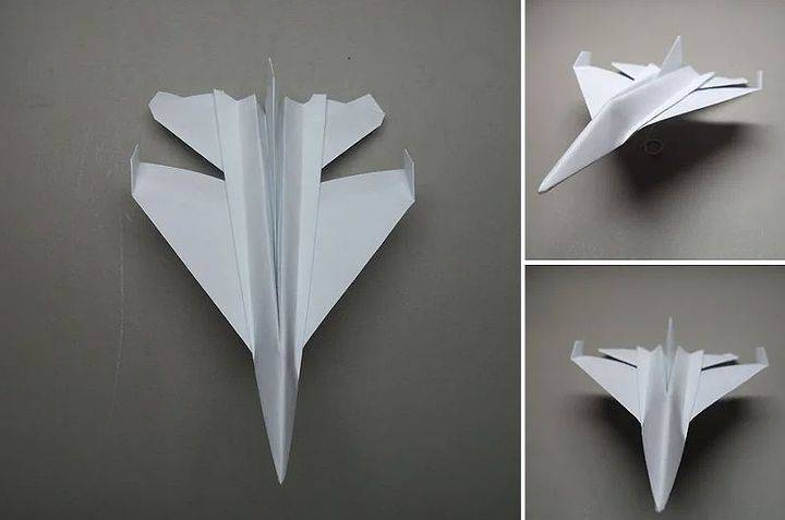 Варианты изготовления таких бумажных игрушек можно найти в интернете или же сделать истребитель из бумаги по такой схеме: