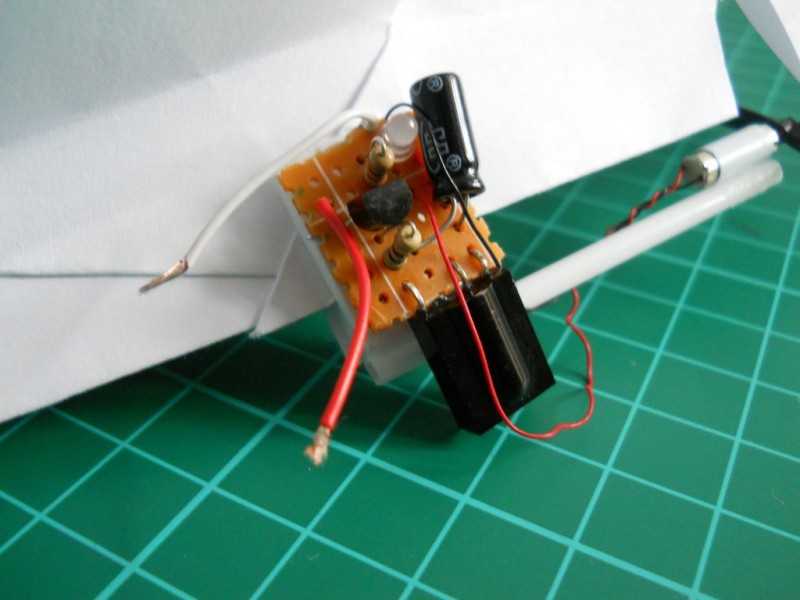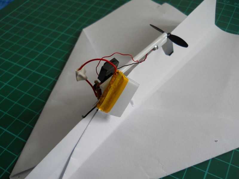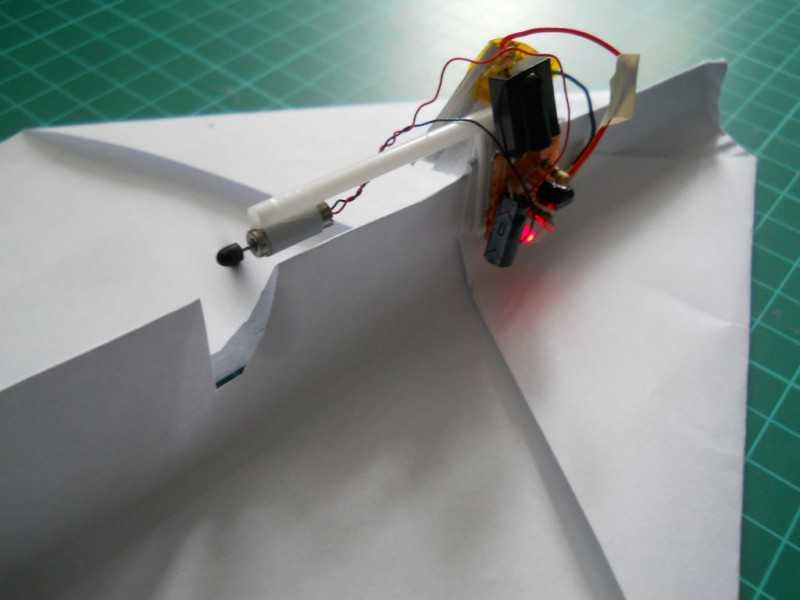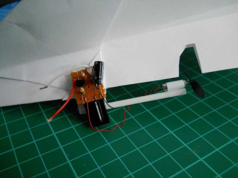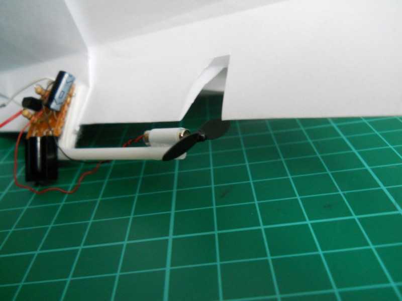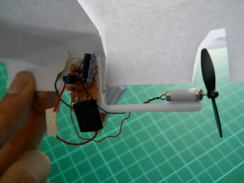Теперь необходимо установить моторчик на модель. Для этого закрепить плату, в центре тяжести, а также вырезать место для пропеллера.