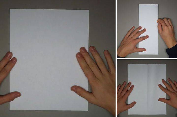 - Берем лист формата А4. Края листа сворачиваем к середине, при этом расстояние между углами должно составлять около 3 см.