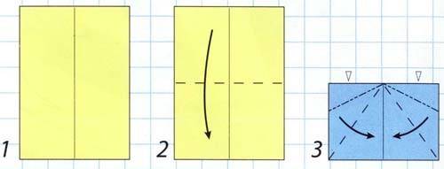 - Складываем заготовку пополам, вершина острого угла располагается посередине нижнего основания.