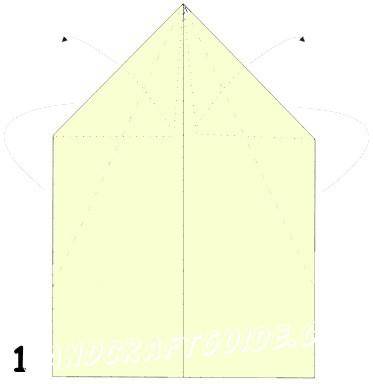 3. Вновь используем продольную линию и складываем самолетик пополам. Края нужно отгибать так, как отмечено на схеме.