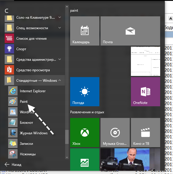 Меню Пуск в зависимости от версии Windows отличается, на скриншоте ниже показано как зайти в Paint в Windows 10, потому что я пользуюсь именно этой операционной системой.