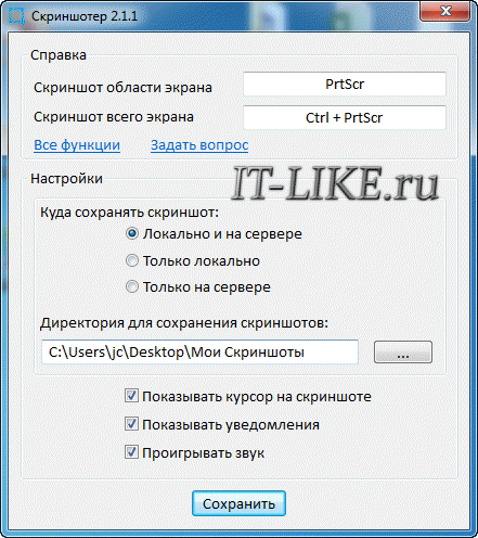 Далее можем определить куда сохранять скриншоты. По умолчанию, картинки сохраняются на жёсткий диск и загружаются на собственный сервер скриншотера (чтобы вы могли получить и отправить ссылку). Можно ограничить только жёстким диском (локально) или только сервером. Заметьте, никаких ограничений на количество, отправляемых на сервер, файлов нет.