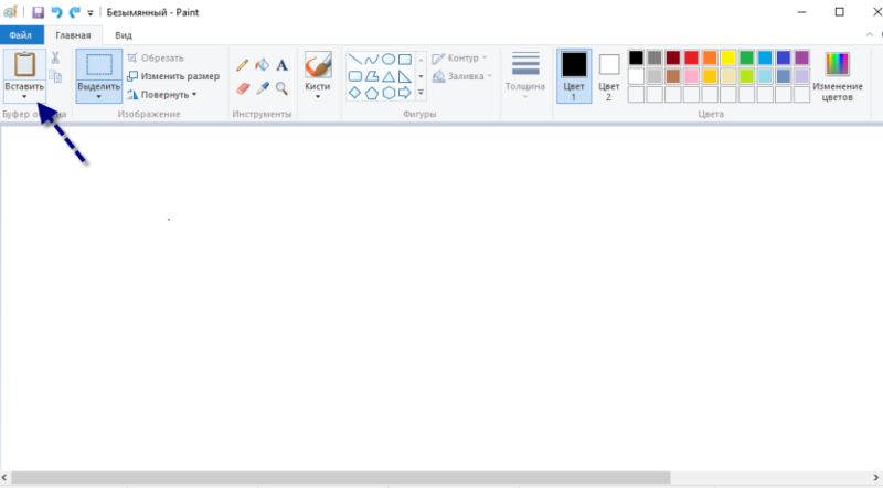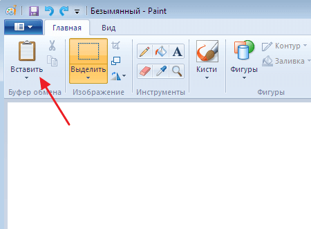 После открытия программы Paint вставьте скриншот из буфера обмена с помощью клавиш Ctrl-V на клавиатуре или воспользуйтесь кнопкой «Вставить» на панели инструментов.