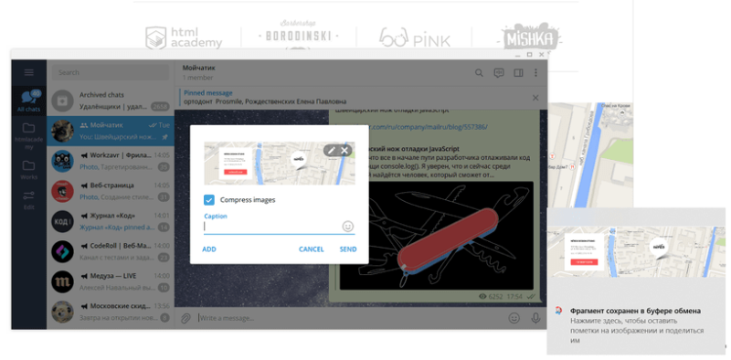 Полученным результатом легко поделиться в мессенджере, вставив изображение из кэша, или экспортировать как JPEG, PNG, BMP. Также можно отправить результат на сервер с автоматическим созданием ссылки на скрин.