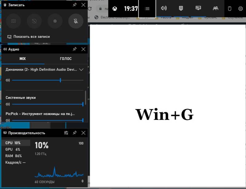 На Windows 10 и 8,1 разработчики придумали ряд особенностей для создания скриншотов. Например, в ОС Виндовс 10 одновременно зажатые кнопки на клаве Win + G открывают доступ к игровой панели. В ней располагается иконка фотоаппарата. Используя ее, владелец ноута может сделать скрин.