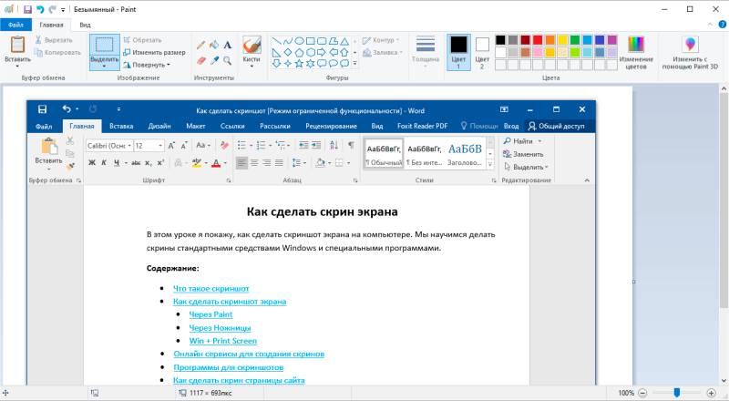 Затем переходим в штатный редактор Paint или текстовый Word. Вызываем вспомогательное меню и выбираем пункт «Вставить» либо нажимаем комбинацию Ctrl + V.