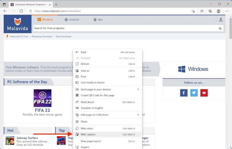 Мы закрываем это руководство, рассказывая вам о Microsoft Edge. В некотором смысле функция веб-захвата интегрирована в систему, поскольку это браузер по умолчанию для Windows 11. Когда вы находитесь в сети, щелкните правой кнопкой мыши пустое место и выберите Веб-захват.
