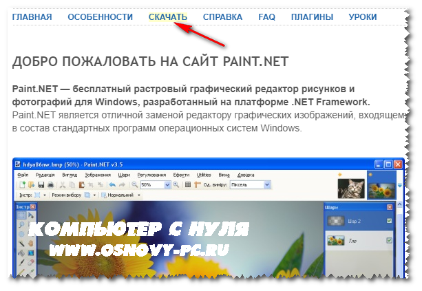 На главной странице описаны преимущества и возможности Paint.net и есть страница скачать.