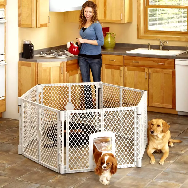 Простой вольер для собаки имеет вид ограждения, которое можно установить в любом месте комнаты, а при необходимости – перенести или собрать. В таком манеже будет комфортно щенкам, которые не могут выбраться или перепрыгнуть через ограждение. В то время как их мама будет свободно заходить или выходить из манежа.