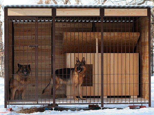 Утеплять весь вольер нецелесообразно и затратно. Защитить от холода нужно будку и ту часть жилища, где немец отдыхает
