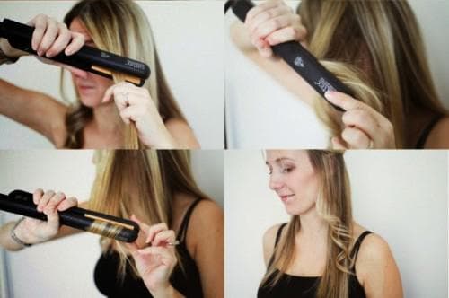 - Закрепите волосы в утюжке и протяните его по волосам, слегка заворачивая вниз, словно подкручивая в локон.