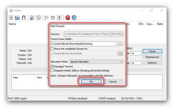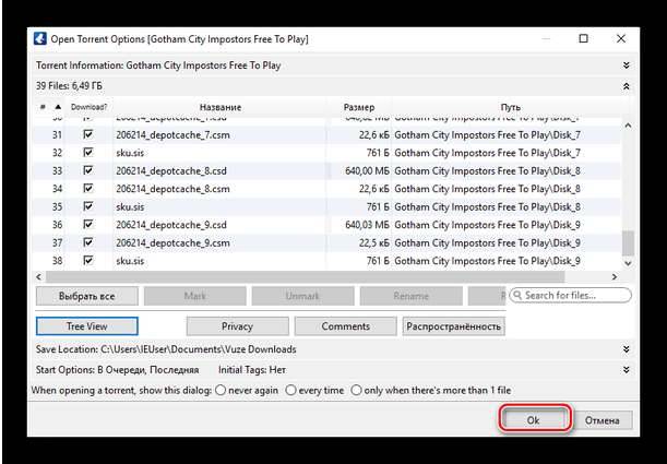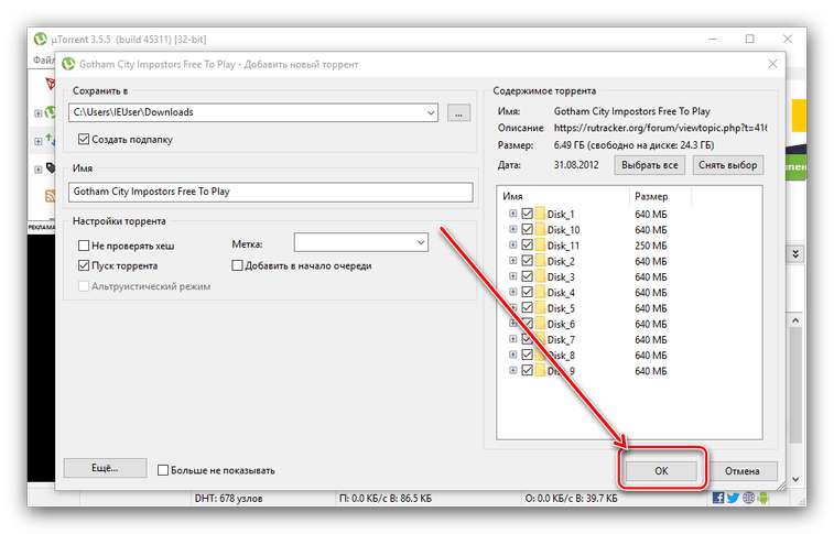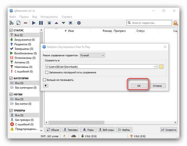 Вы уже установили программу для скачивания (торрент-клиент), скачали сам торрент-файл. Теперь для загрузки основного файла (игры, фильма и т.д.) надо запустить торрент-файл для начала скачивания. Это делается двойным кликом, как и любой другой файл. Затем откроется торрент-клиент и предложит указать место для сохранения основного файла. Укажите новое место или оставьте по умолчанию. Затем нажмите “ОК” и начнется скачивание файла.