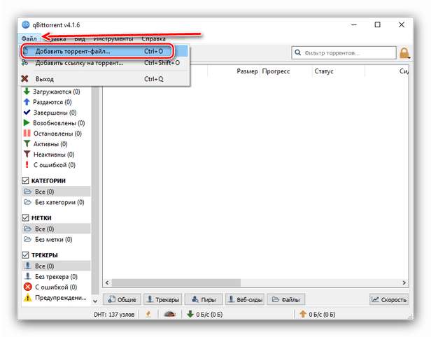 - Для загрузки торрент-файла используйте меню, пункты «Файл» – «Добавить торрент-файл».