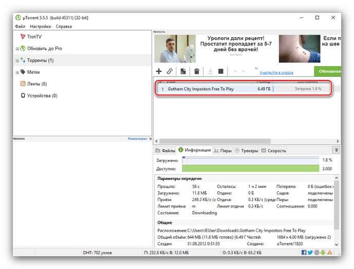 Главный недостаток uTorrent — большое количество рекламы. Баннеры встроены в интерфейс, отключить их можно только покупкой лицензии. Впрочем, этот недостаток не мешает управлять раздачами и скачивать файлы.