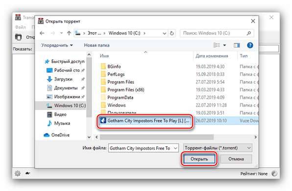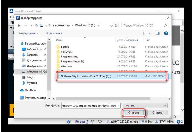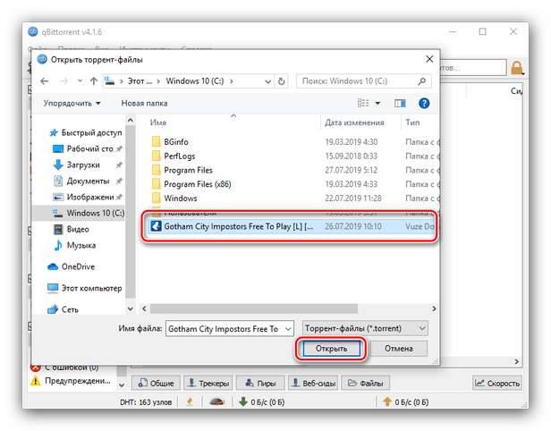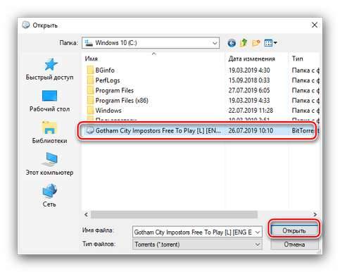 - Раскроется диалоговое окно «Проводника», в каком следует отыскать torrent-файл и избрать его.
