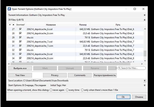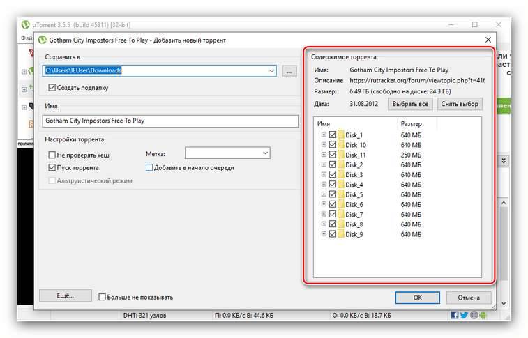- Предоставление подробной информации о раздаче с возможностью указать, какие файлы следует скачивать.