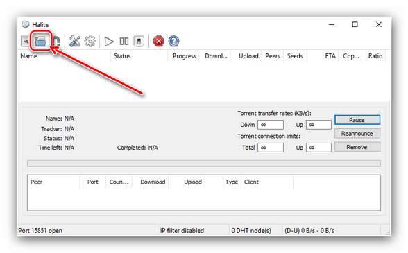 После пуска программки воспользуйтесь панелью инструментов – изберите поочередно пункты «Файл» – «Открыть» – «Торрент-файл».