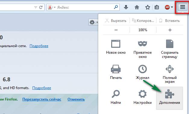 Скачать Download Master, в принципе можно обойтись и без него, качает нормально, но на порядок медленнее, поэтому советую к установке. Для перехода в список дополнений, нажимаем значок справа —> Дополнения.
