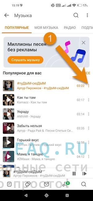 Выберите нужный трек. В конце строки с исполнителем и названием, есть троеточия. Нажмите на них.