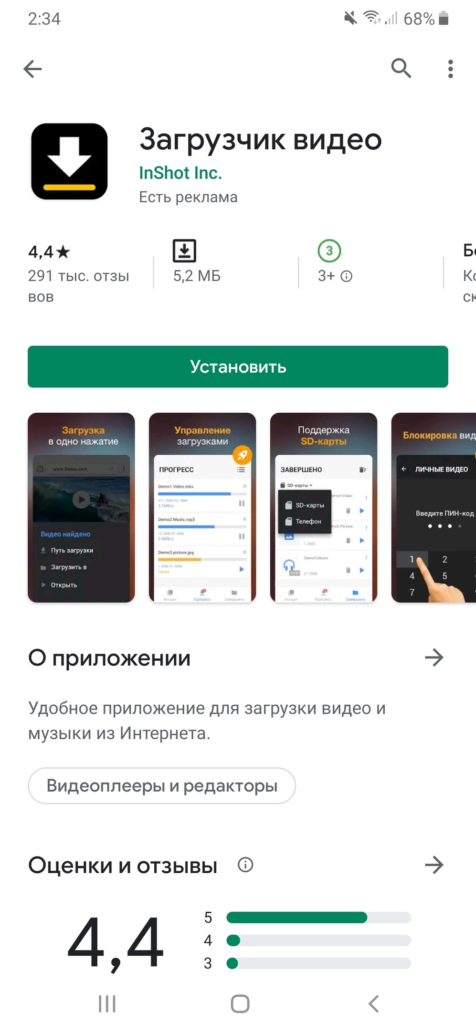 - Открываем на телефоне приложение Google Play и вводим в поисковой запрос «Загрузчик любых видео 2019». Открываем результат и загружаем утилиту.