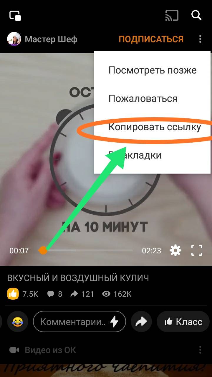 - После успешной установки нам нужно вернуться в одноклассники, чтобы скопировать ссылку видеоролика, который нам нужно скачать. Для этого открываем необходимый ролик и кликаем на кнопку в виде троеточия, расположенную в верхнем правом углу. В отобразившемся меню выбираем «Копировать ссылку».