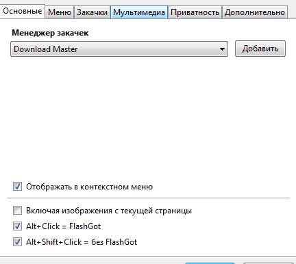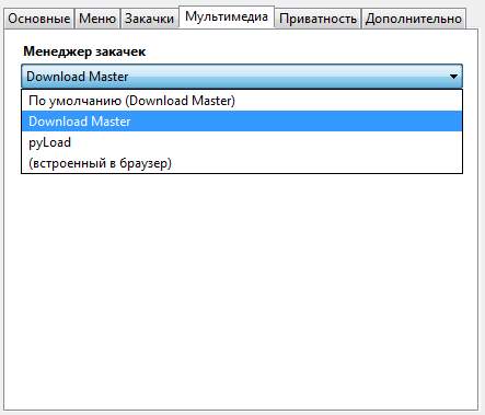 Во вкладке «Мультимедиа» выбираем, через что будем скачивать видео, если у вас установлен Download Master, то лучше выбрать его, если нет, сгодятся и возможности самого браузера.