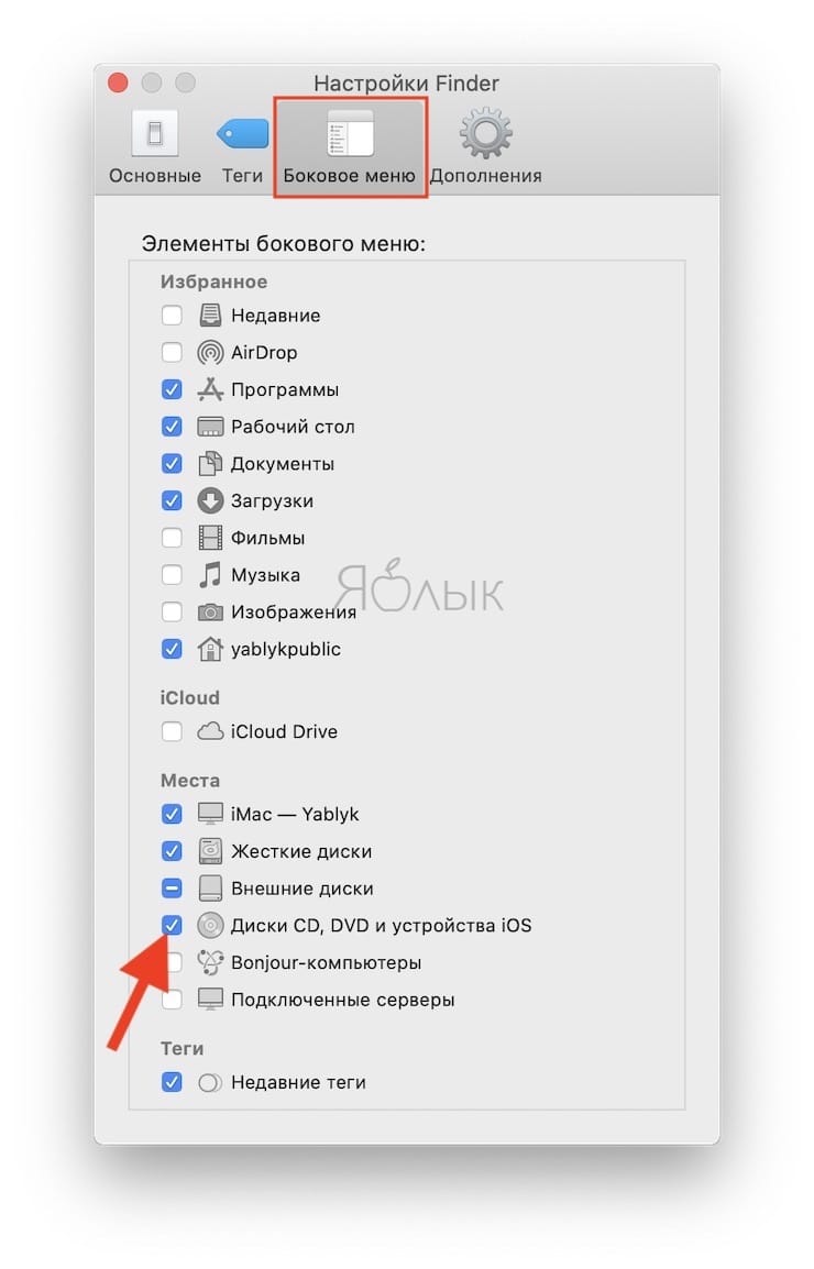 В случае, если устройство не отображается, перейдите в Настройки Finder и установите галочку возле пункта Диски CD, DVD и устройства iOS.