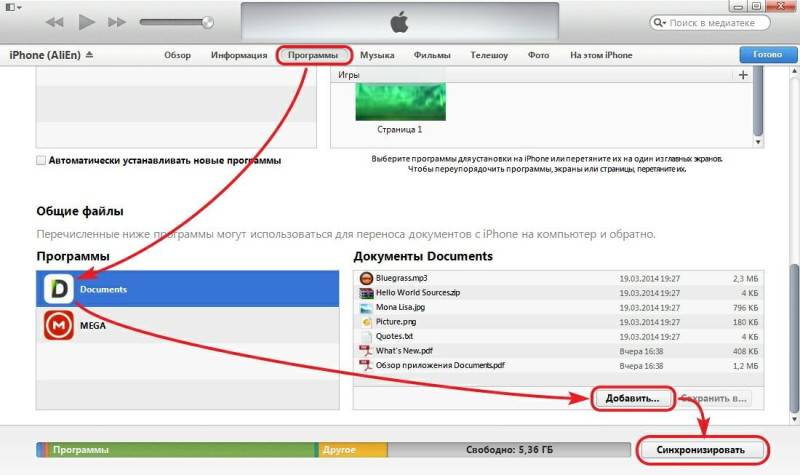 Дальше нужно перейти во вкладку, которая называется «Программы». Нашли вкладку? Посмотрите внимательно, она может появиться не сразу. Прокрутите всю страницу. Вы увидели раздел «Общие файлы»? В нём можно нажать на приложение «Документы». И в окне в правой части будут все документы, которые вам нужны. Следующим этапом добавьте документ, выбрав нужный документ. Найдите кнопку «Синхронизировать». В приложении должен появиться требуемый файл.