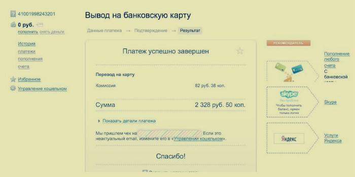 В том случае, когда вы не стали заказывать карту Яндекс.Деньги, можете перевести определенную сумму на карту другого банка.