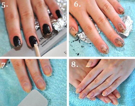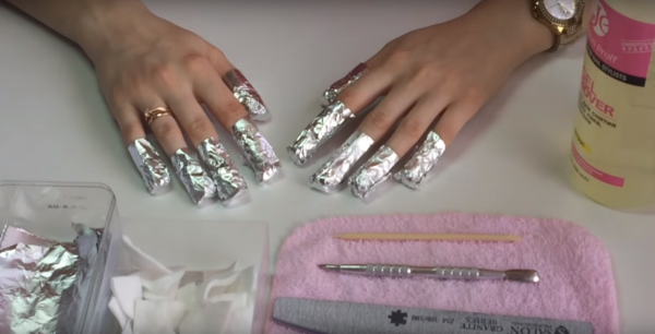 - Оберните вокруг пальца кусочки фольги. И подождите 15 минут. В это время делайте легкий массаж ногтей, сильно не придавливайте, чтобы не повредить ногтевую пластину. Затем снимите фольгу.