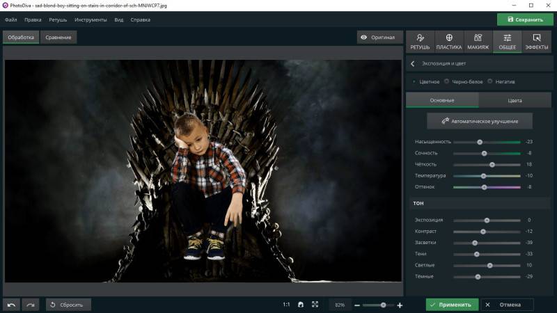 - Раздел «Общее» содержит опции для базового улучшения фотоизображения: кадрирование, настройка экспозиции и цвета, добавление резкости, размытия, виньетки.
