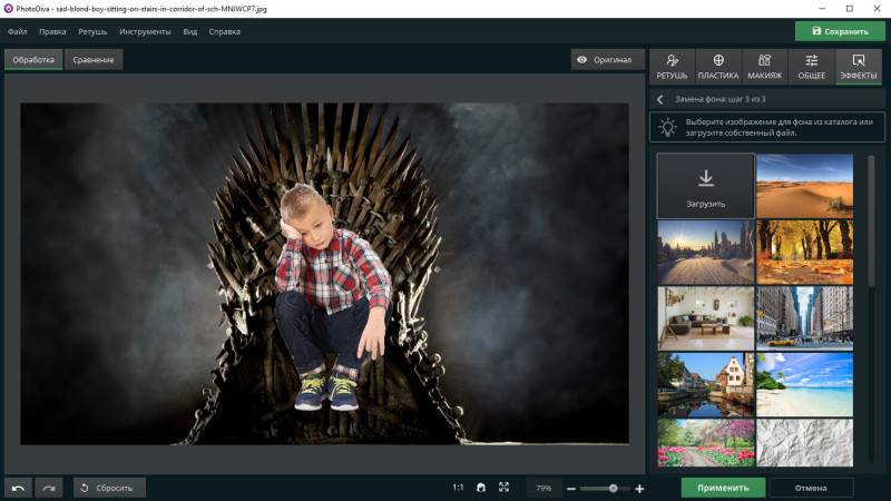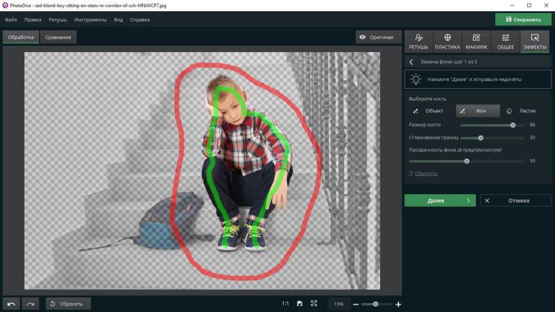 Чтобы сделать из нескольких фото одну общую, перейдите в раздел «Эффекты». Воспользуйтесь инструментом «Замена фона». Укажите с помощью зеленой кисти часть изображения, которую вы хотите сохранить. Вы можете просто обозначить границу фотоснимка одной линией. С помощью красной кисти выделите часть, которую нужно удалить для добавления другой картинки.