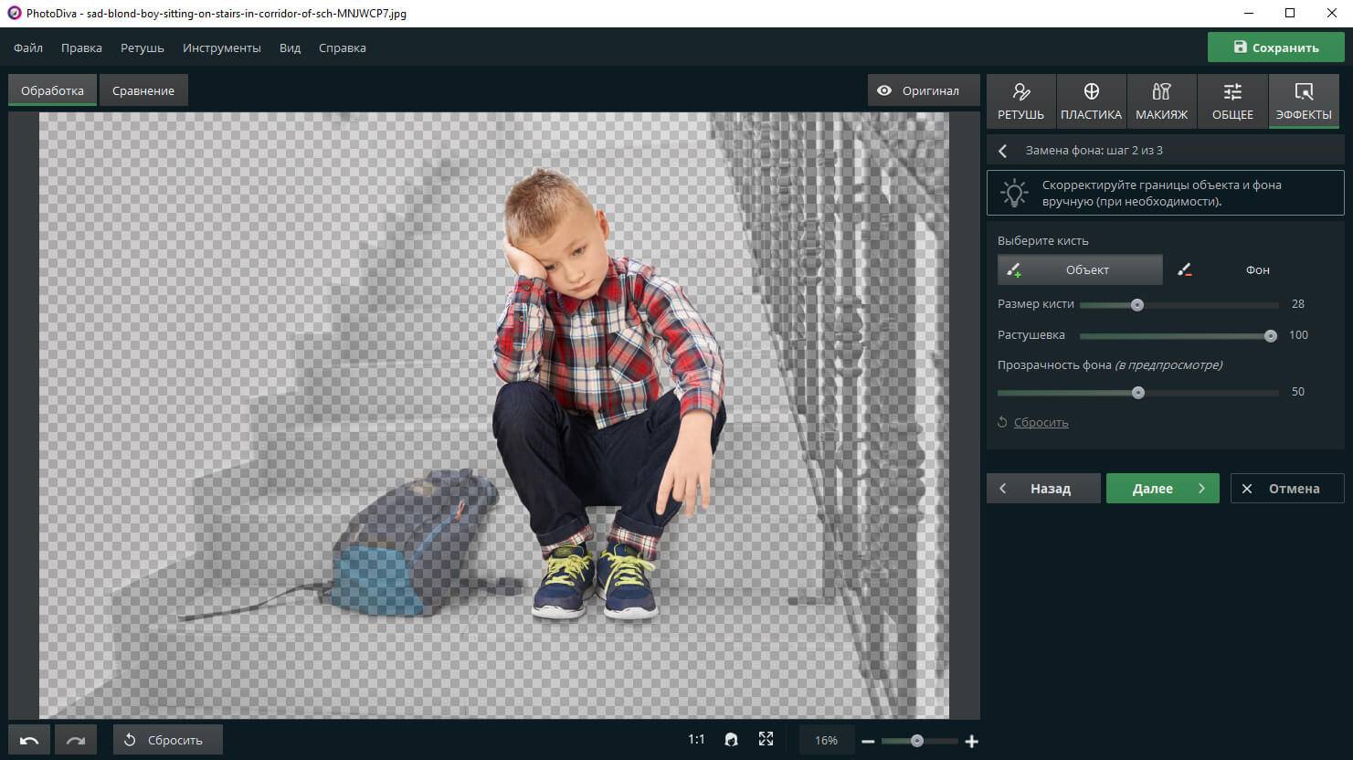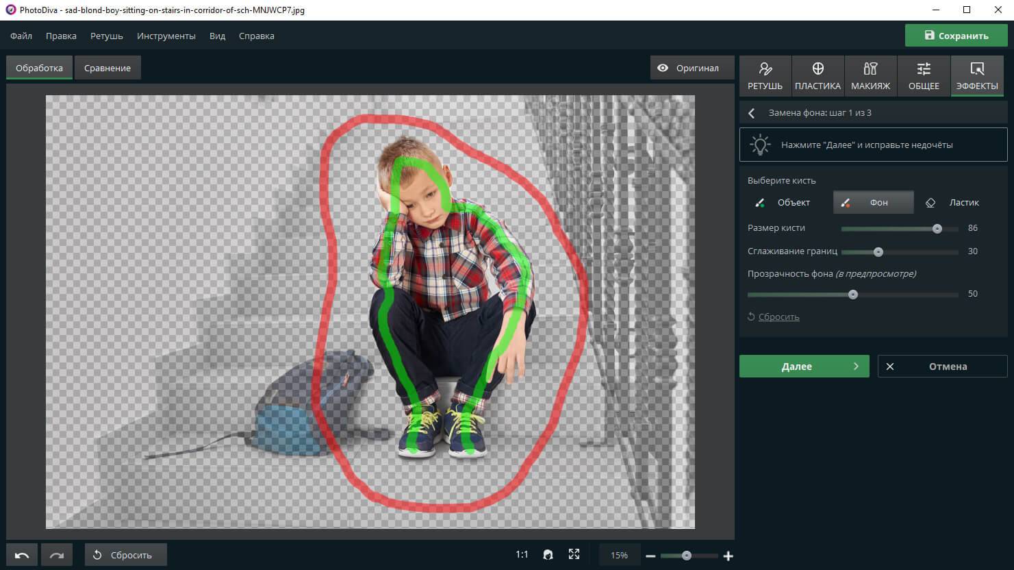 Выберите кисть «Фон» и настройте ее размер. Удалите лишние части изображения. Если вы хотите, чтобы переход между кадрами был мягким, то повысьте значение «Растушевки».