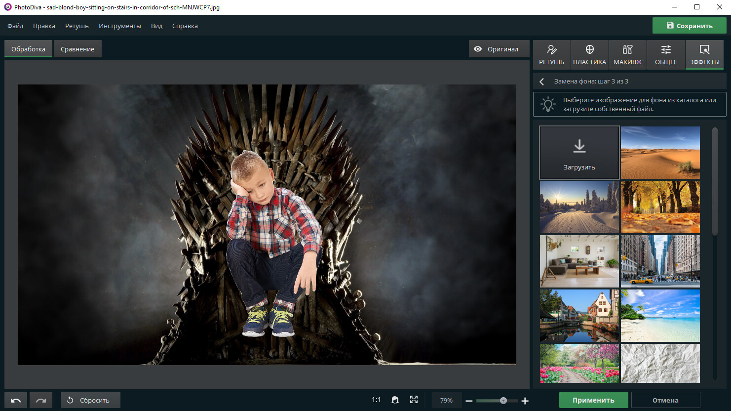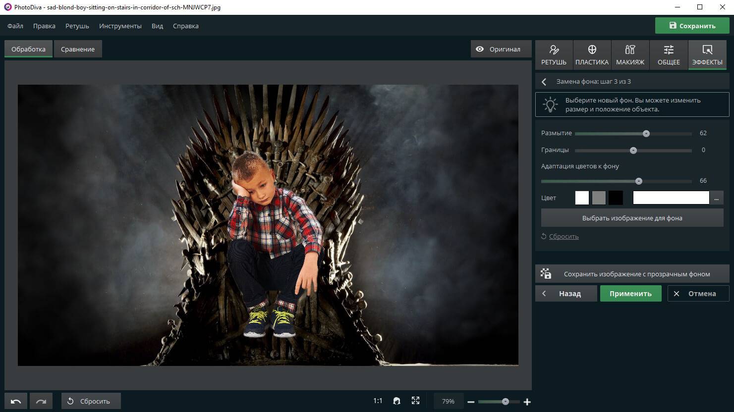 Чтобы сделать из нескольких фото одну общую, перейдите в раздел «Эффекты». Воспользуйтесь инструментом «Замена фона». Укажите с помощью зеленой кисти часть изображения, которую вы хотите сохранить. Вы можете просто обозначить границу фотоснимка одной линией. С помощью красной кисти выделите часть, которую нужно удалить для добавления другой картинки.