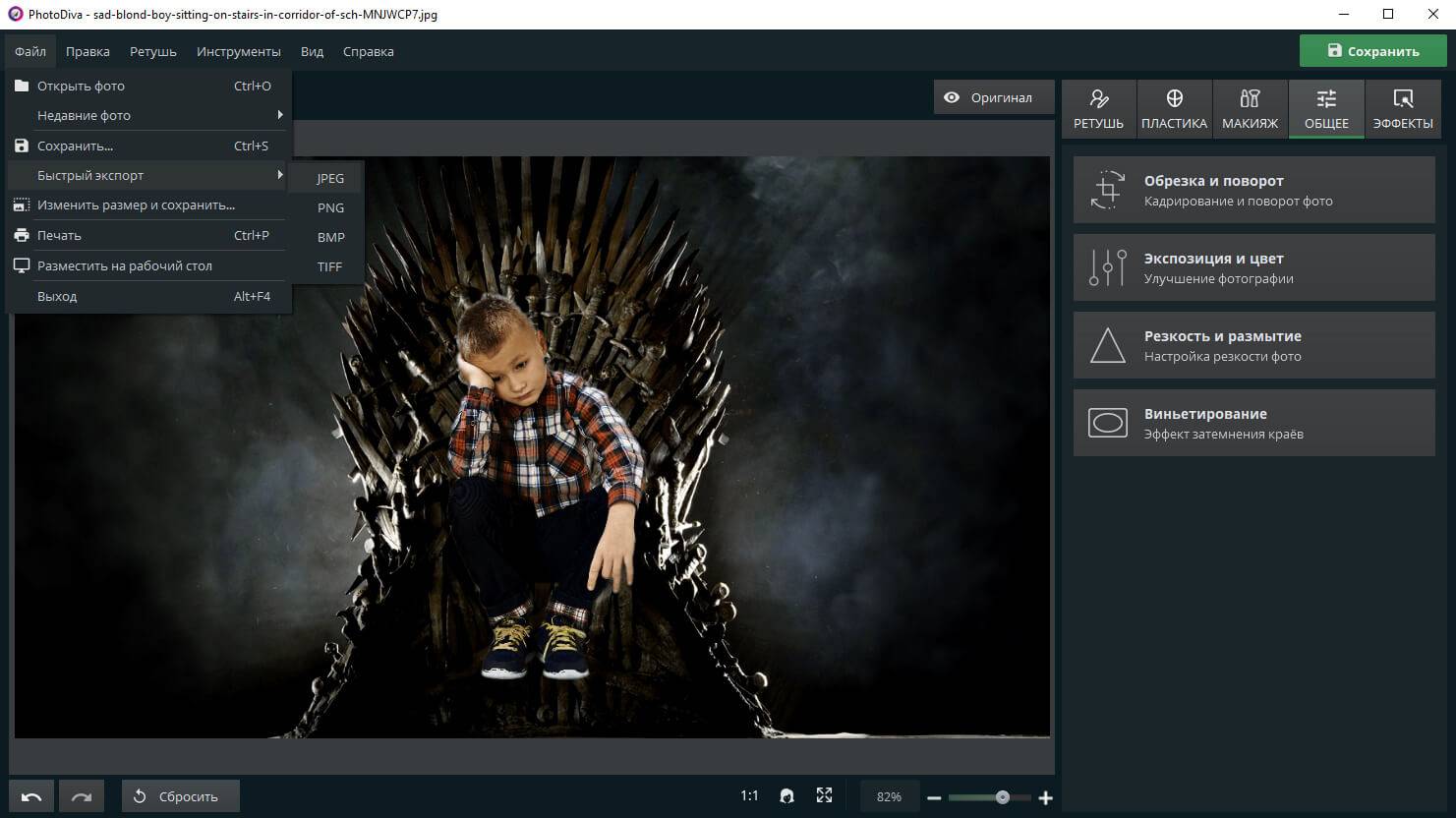 После того, как вам удалось совместить фото, вы можете сохранить результат в популярном формате. Если вы хотите оставить исходные размеры снимка, то нажмите «Файл» — «Быстрый экспорт». Выберите подходящий формат, а затем укажите папку для сохранения и название документа.