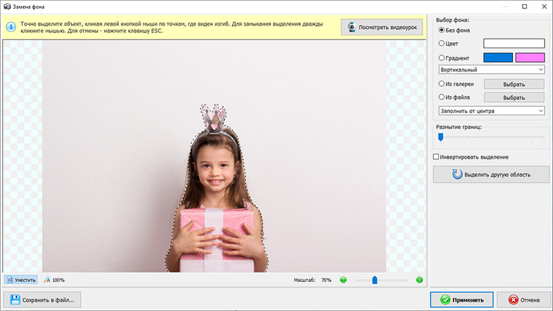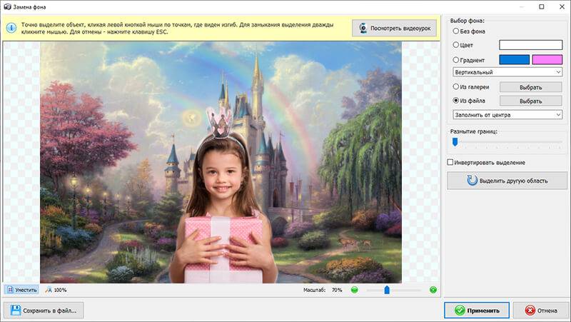 Не спешите! Чем точнее будет обводка, тем лучше потом будет смотреться вырезанный объект на новой подложке. Закончили? Замкните обводку в начальной точке двойным кликом мыши. «Домашняя Фотостудия» тут же удалит старый фон. Вы сможете выбрать новый на панели справа. Это может быть цвет или градиент, картинка из каталога программы или с ПК.
