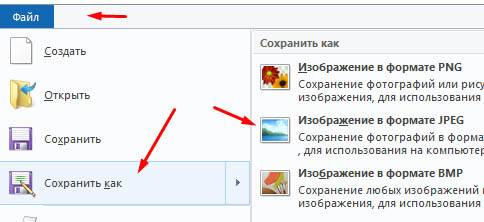 Переходим в уже знакомый нам “Файл”, выбираем “Сохранить как”, а затем выбираем нужный формат. Я обычно выбираю “Изображение в формате JPEG”.