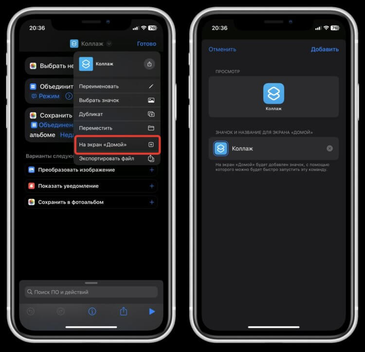 Но каждый раз залазить в приложение Команды может быть неудобно. Если вы часто делаете коллажи и склеиваете фотографии прямо на Айфоне, то самый лучший вариант — добавить эту быструю команду на рабочий стол. Делается это очень просто: