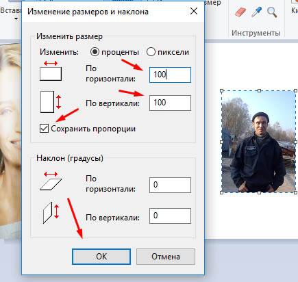 Если вы соединяете фотографии разных форматов и размеров, то подогнать размер можно нажав вверху на “Изменить размер”, а затем подобрать масштаб в процентах или пикселях.