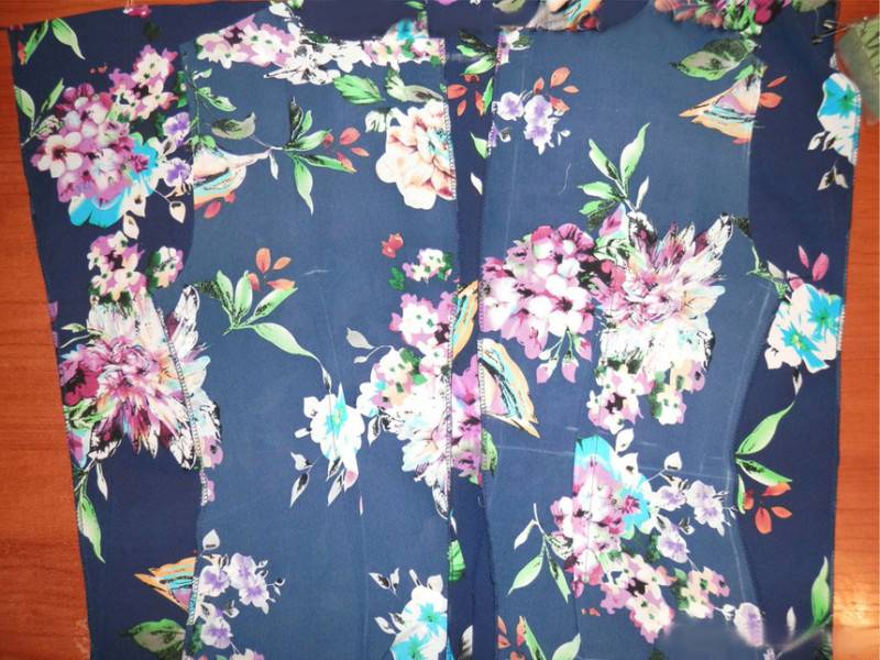 Оформляем срезы пройм и горла обтачками. Приутюживаем так, чтобы на изнанке получился кантик.
