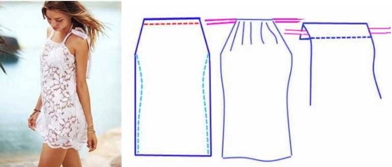 Сарафан с открытой спиной также можно сшить по простой выкройке. За основу берется прямоугольная ткань. Ширина равняется обхвату бедер. Длину измеряют от подмышечных впадин по фигуре. Параметр можно варьировать в зависимости от модели. Когда основа готова, приступают к определению линий, по которым будет идти резинка.