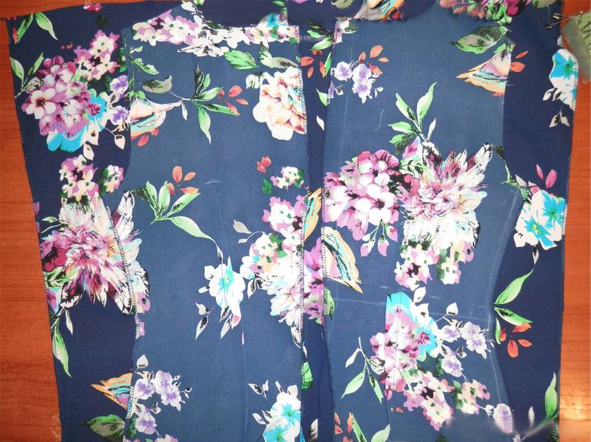 Берём булавки и скалываем плечевые швы. Сами рисуем мелом линию горловины и пройм. Не забываем про припуски 1см. Отрезаем лишнюю ткань. Далее, нужно пришить обтачку. Стачиваем обтачку спинки и полочки. Желательно проклеить обтачки клеевой подкладкой. Оверложим нижний срез.
