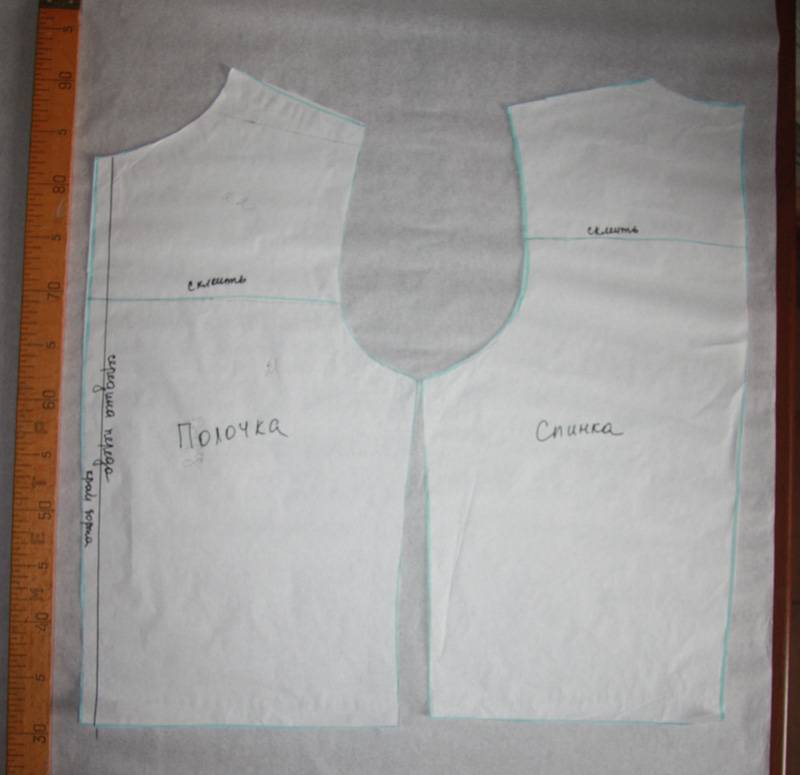 - От конечной точки плеча отложите вертикаль вниз 19-22 см, затем 3-4 см вправо и закруглите в виде проймы. От этой точки отмеряйте 17 см до линии талии, или можно не выкраивать бокового шва, тогда линию продолжите до низа изделия. Начертите низ изделия, соединив нижнюю точку середины и конечную точку бокового шва.