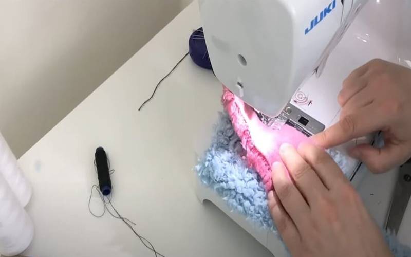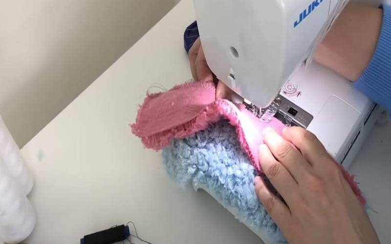 Складываем детали лицом к лицу, сметываем и, заправляя ворсинки внутрь (в начале и конце строчки делаем закрепки).