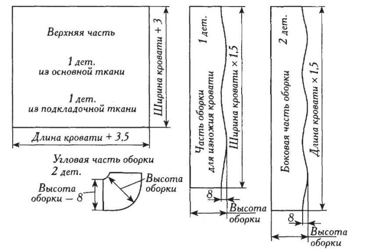 Для пошива стандартного прямоугольного покрова берут отрез материи, равный размерам кровати. Добавляют по 25 см на свисание краев, 1,5 см – на подшивку и 5 см – на усадку. Если нет ограничительных стенок, чтобы белье было скрыто, учитывают припуски со всех сторон.
