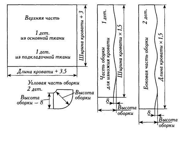 При расчетах размера оборки пользуйтесь правилом: длина ткани по боковым сторонам должна быть больше длины кровати в полтора или два раза. А если хочется пышности, то стоить немного, увеличить длину, и тогда оборка будет смотреться более нарядно.