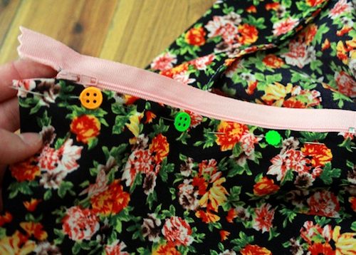 - Подметайте и сшейте переднюю и заднюю часть юбки вдоль правого бокового выреза от нижней линии до контрольной отметки, которая определяет конец молнии».